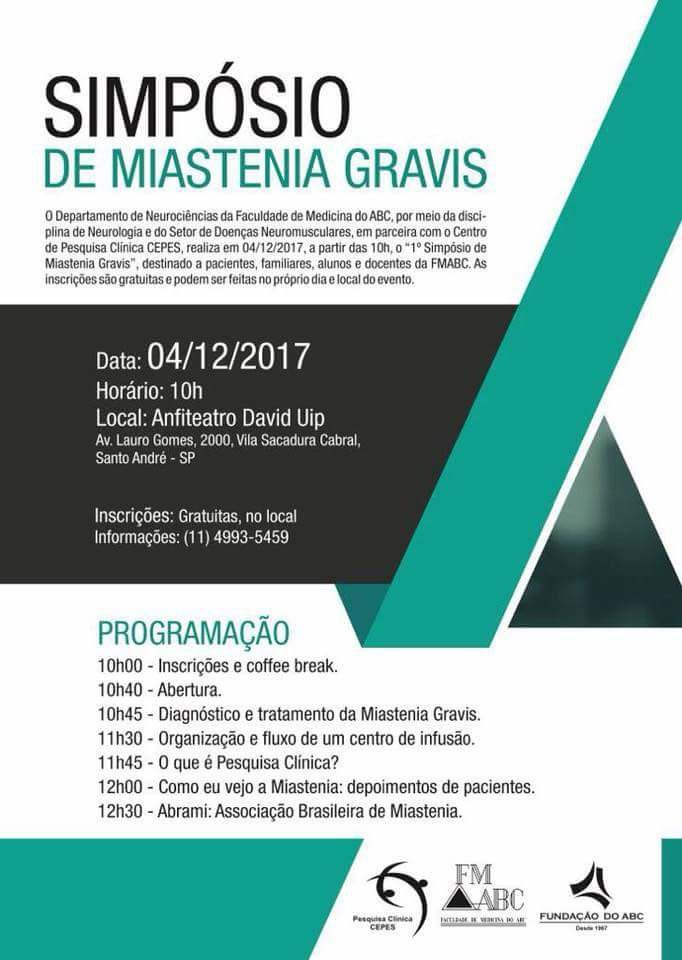 O evento foi realizado dia 04/12/2017, na Faculdade de Medicina do ABC, onde pacientes, familiares, médicos e profissionais de saúde trocar conhecimentos e experiências sobre miastenia, bem como ter mais esclarecimentos sobre o processo de uma pesquisa clínica.