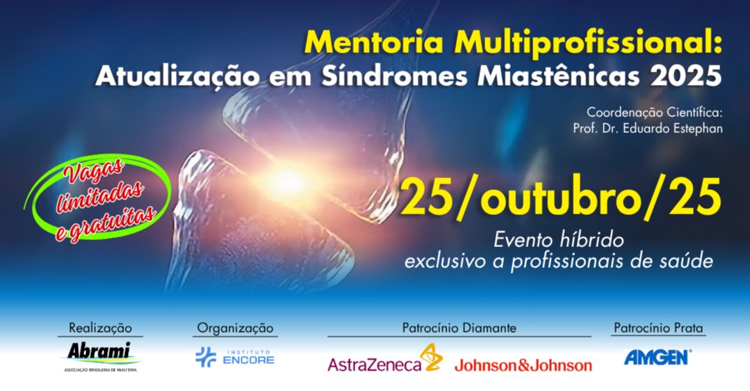 A Abrami - Associação Brasileira de Miastenia realizará a edição híbrida da "Mentoria Multiprofissional: Atualização em Síndromes Miastênicas 2025", no dia 25 de outubro de 2025, na APM - Associação Paulista de Medicina, em São Paulo/SP.